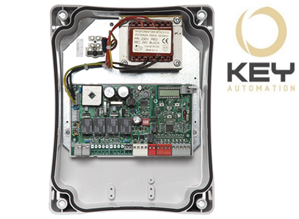 For two motors for swing gate, 24 Vdc, with electric clutch and slowdown in opening and closing. Built-in receiver